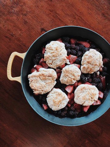 Place fruit into a cast iron skillet with juices, placing dough atop the fruit. Put a tablespoon of butter on top of each biscuit. Bake for 30-45 minutes, or until dough is browned.